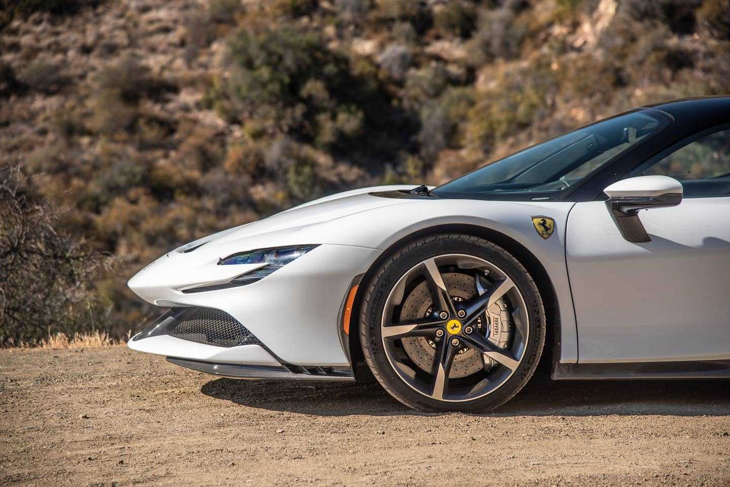 Hitting Stunt on dusty Michelin Pilot Sport Cup 2 tires from a turnout is like exiting Le Mans pits in the rain. At least for these first few hundred feet, the power-to-grip ratio is off the charts. Like the Roma, the SF90 fires up with a capacitive Start «button» at the bottom center of the steering wheel which, along with the smooth, haptically-actuated left side of the steering wheel, does not do justice to the car’s mechanical soul.