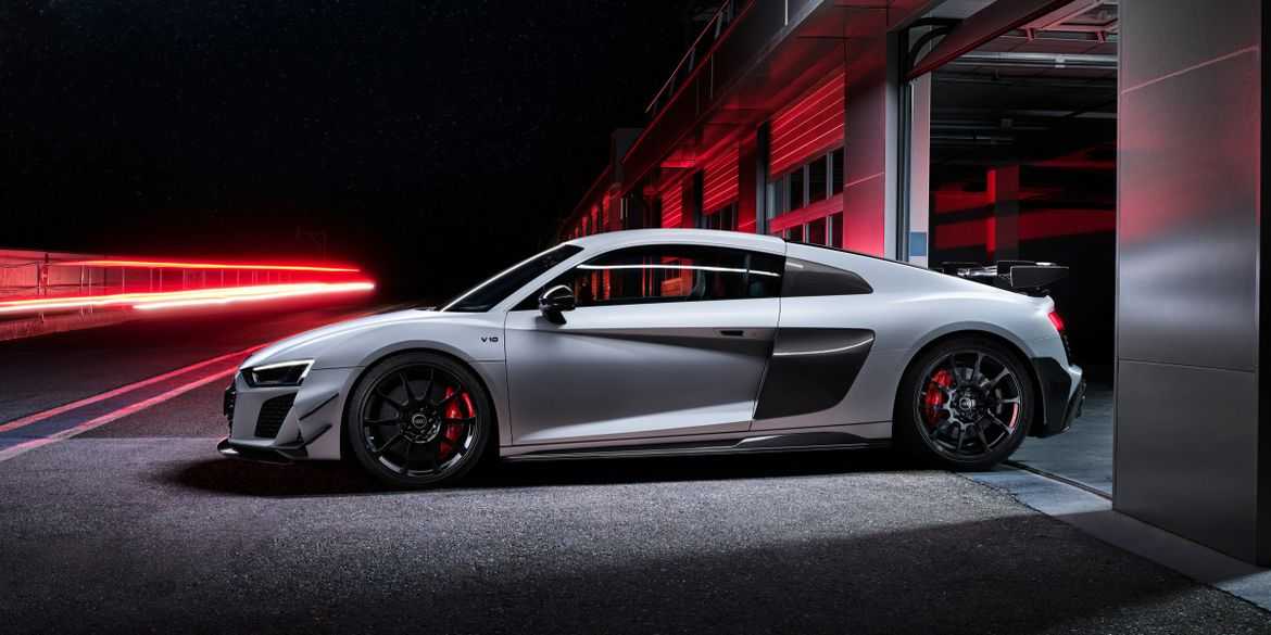 Audi R8 с приставкой GT увидела свет в мае 2010 года. Машина задумывалась как более легкая и мощная версия стандартной «двухдверки» с мотором V10: снаряженная масса снизилась до 1525 кг, а мощность выросла до 552 л. с. Внешне такие R8 можно было отличить по аэродинамическому «оперению» из карбона и двум круглым патрубкам выхлопной системы.