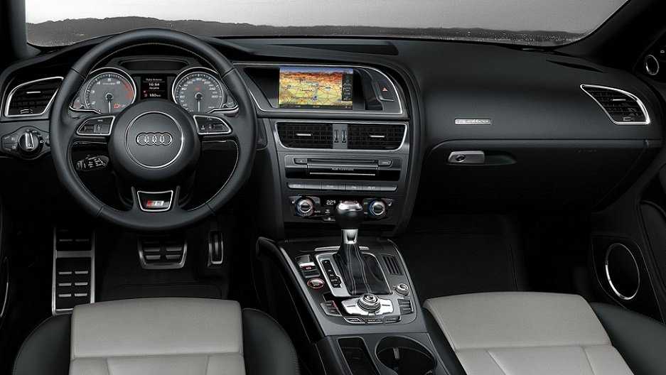 В салоне Audi S5 водителя и пассажира ожидают спортивные сиденья с электрической регулировкой поясничной опоры, спортивный руль с эмблемой S line, обивка сидений из ткани «Sprint» кожи черного цвета и аудиосистема «Concert» с 10 динамиками и сабвуфером сзади суммарной мощностью 180 Вт.