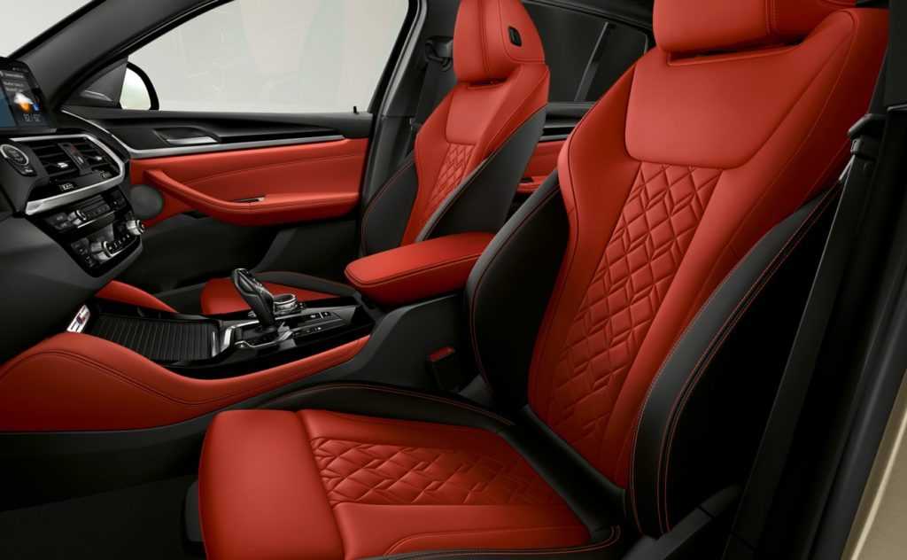 Передние спортивные кресла оснащены механическими регулировками, а для места водителя предусмотрена настройка ширины спинки. По заказу в отделке BMW X4 ставят планки с гальваническим напылением, улучшающим восприятие салона автомобиля. Общий дизайн салона перекликается с интерьером машин 3-й серии с кузовом G20. Например, конструкторы применили унифицированный с седаном блок управления трансмиссией. Для отделки кресел BMW X4 предлагается перфорированная кожа, по заказу применятся прострочка контрастной нитью.