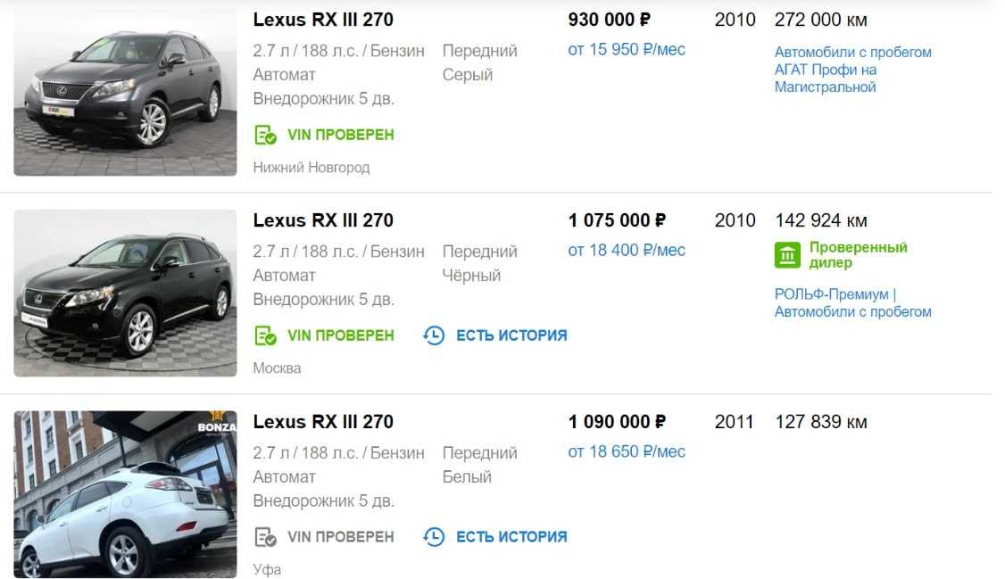Самые шоколадные версии Lexus RX III варьируются от 900 тысяч до 2 миллионов рублей. И этот дифференциал в основном связан с годом и пробегом. Для самых дешевых он превысил 200 000 км, для самых дорогих — приблизился к 50. Это тоже кое-что говорит о выживаемости автомобилей: владельцы RX гонят их до победителей и не выбрасывают 100 000 км на произвол судьбы.