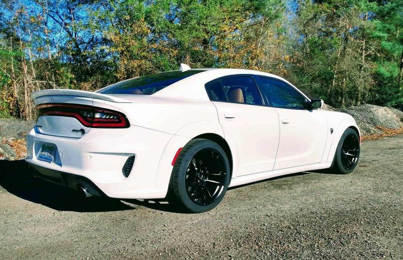 A handsome side and rear view of the Dodge Charger SRT widebody in Frostbite. Photo: Connie Peters
