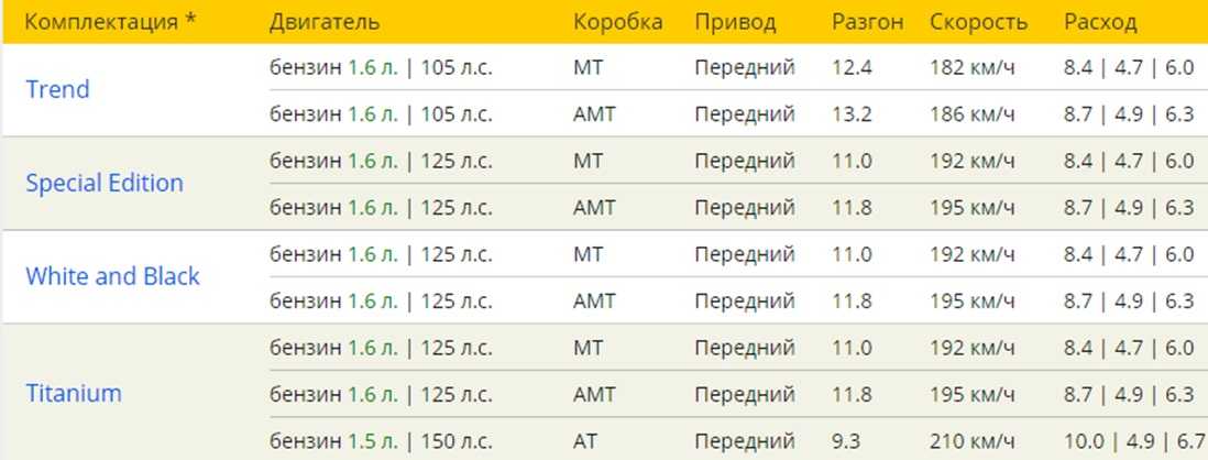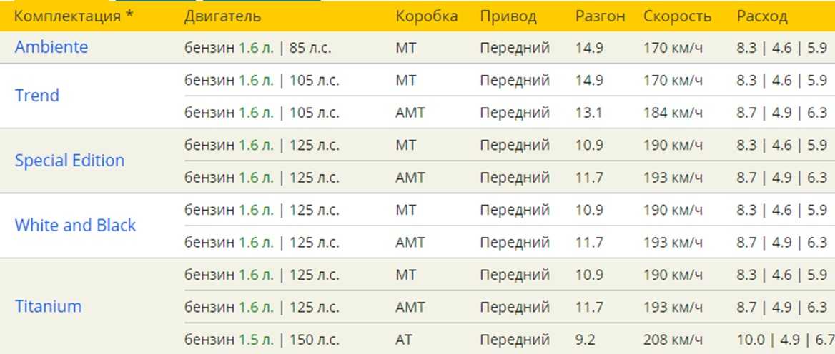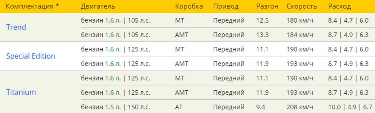 Линейка силовых агрегатов объемом 1,5 литра. В версии Титаниум 1,5 и 1,6 л. Мощность от 105 до 150 л.с. Тип трансмиссии: механика, автомат, вариатор. Передний привод. Разгон до сотни за 9,3 – 13,2 секунды.
