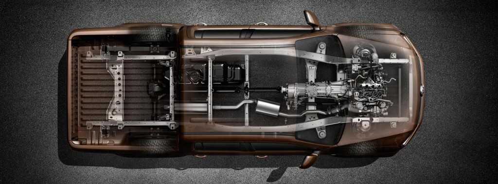 То теперь по умолчанию на грузовичке стоит автоматическая коробка передач на 8 скоростных режимов с постоянным подключением полного привода и без наличия опции понижения скоростей.