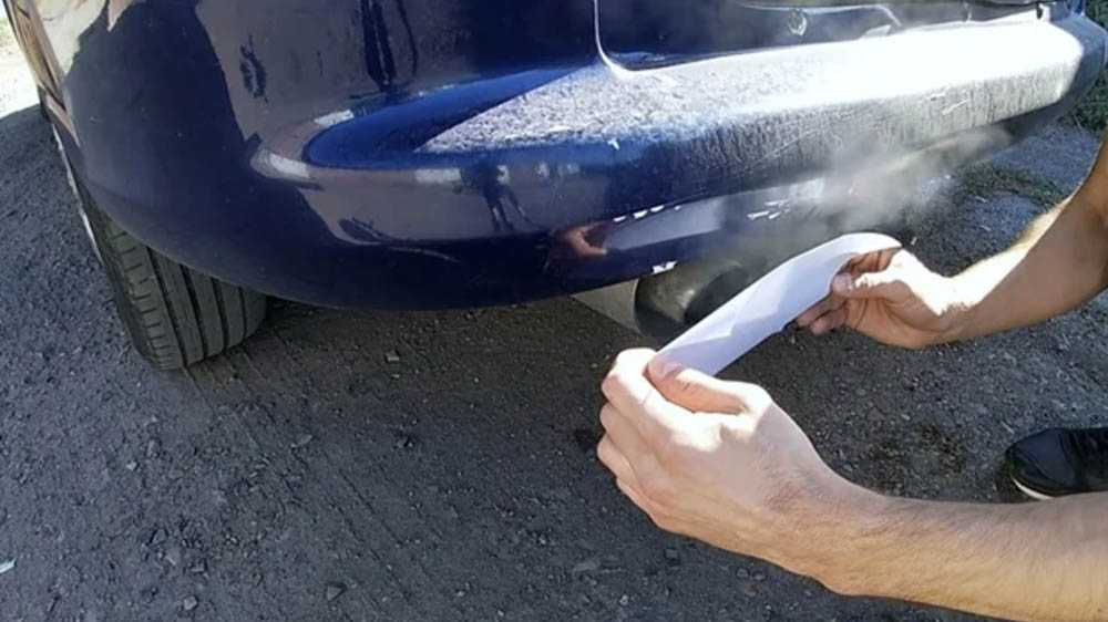 Серьёзно насторожить должен белый дым в выхлопных газах во время работы транспортного средства. Тут можно даже привести небольшой эксперимент, приложив к выхлопной трубе лист белой бумаги. Примерно через 5 минут лист намокнет. Останется дождаться, когда он высохнет, и осмотреть. Если не удастся найти масляные или топливные пятна, значит, белый оттенок дыма связан именно с охлаждающей жидкостью, которая по определённым причинам оказалась в камере сгорания.