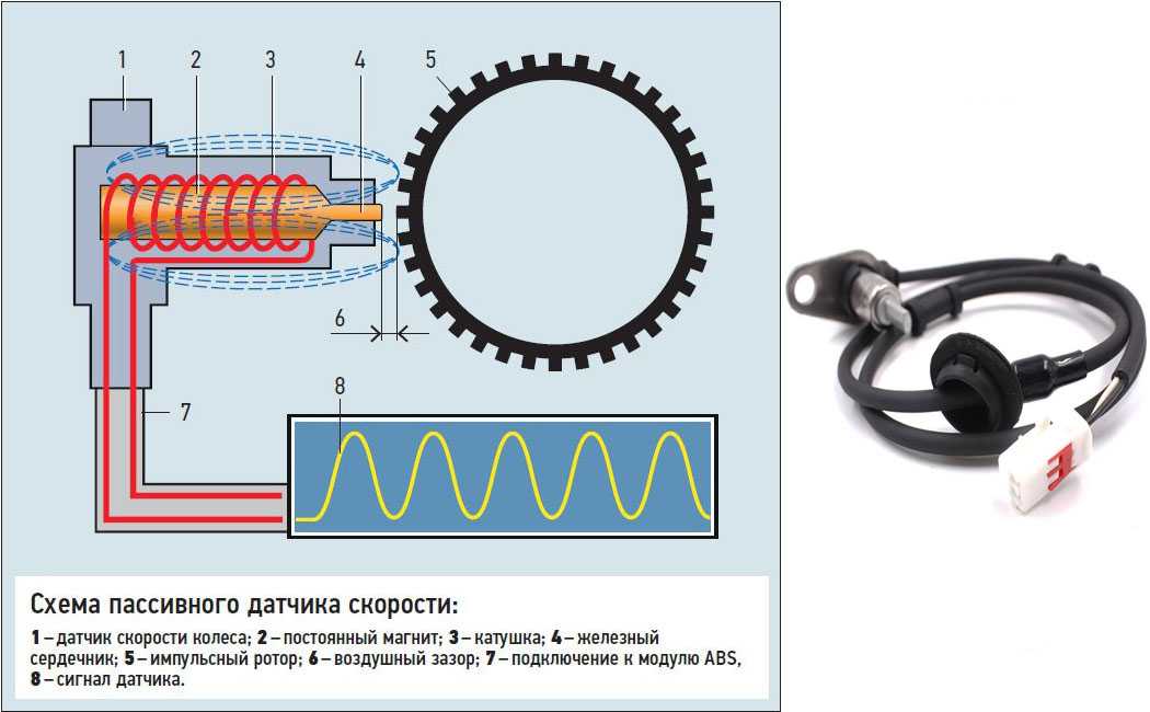 Суть функционирования пассивного элемента очень проста – обмотка генерирует магнитное поле, через которое проходит зубчатый венец. Имеющиеся зубья при проходе через поле оказывают на него влияние, что обеспечивает возбуждение напряжения в датчике. Чередование зубьев с впадинами обеспечивает создание импульсов напряжения, которые и позволяют высчитать скорость вращения колеса.