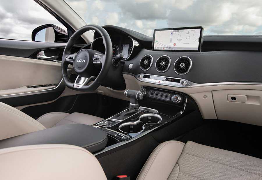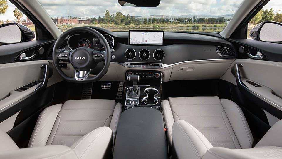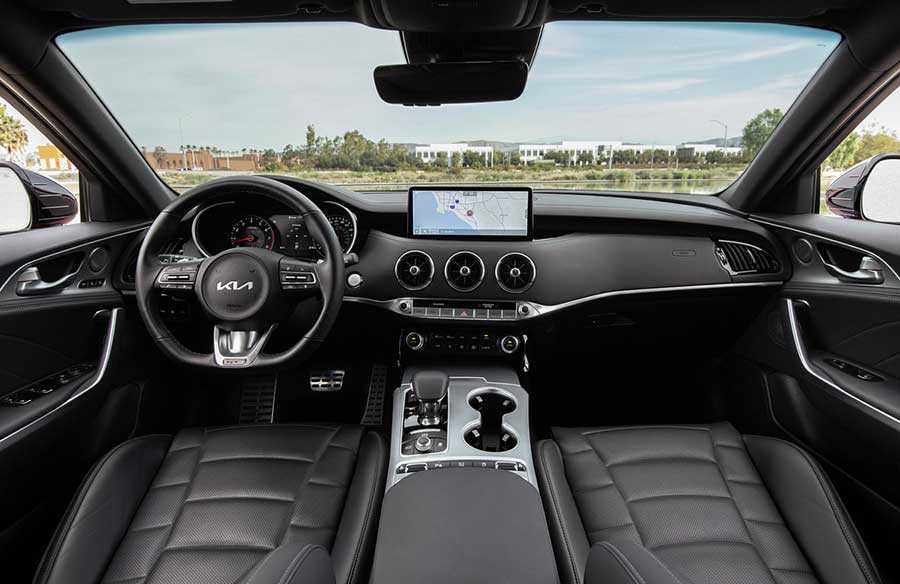 Лифтбек Kia Stinger GT-Line получает семидюймовый дисплей Supervision комбинации приборов, используется система кругового обзора с четырьмя камерами, которые могут передавать на приборную панель изображение со слепых зон (BVM).