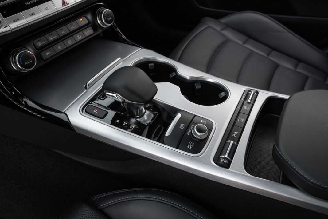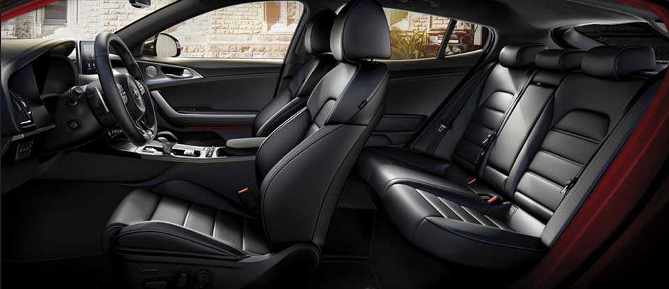 Киа Стингер Джити Лайн – версия, отличающаяся от «младших» комплектаций легкосплавными колесными дисками R19 на разноразмерных шинах (225/40 – спереди, 255/35 – сзади), несколько другим оформлением интерьера.