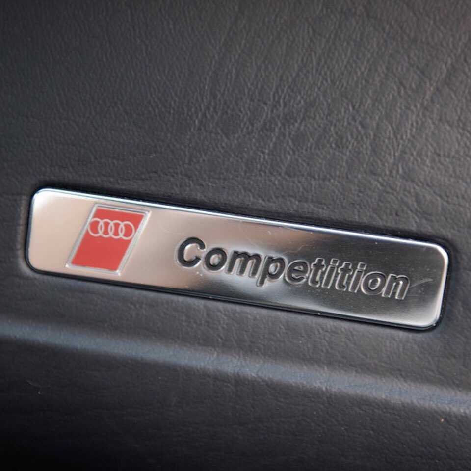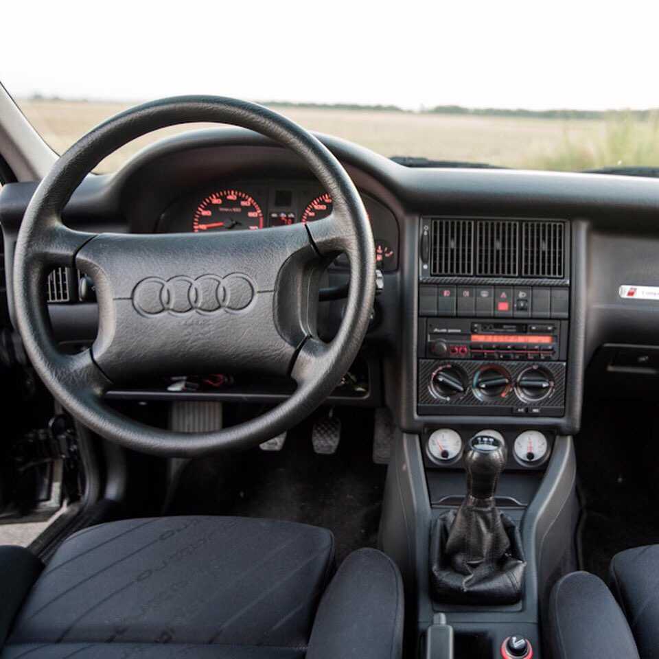 Внутри салона были установлены спортивные сидения, обшитые тканью брендированные вышивкой «Quattro» и серым сатином. Панель приборов вам наверняка знакома, очень похожую вы могли видеть практически на всех автомобилях концерна VAG того периода, например, в VW Passat B4. Лишь красная подсветка бортового компьютера и фирменной магнитолы Audi заметно бросается в глаза. Под магнитолой возле пепельницы установлены дополнительные гоночные приборы отслеживания: температура масла, давление масла и вольтметр. По центру, возле рычага коробки передач, находится кнопка включения блокировки дифференциала.