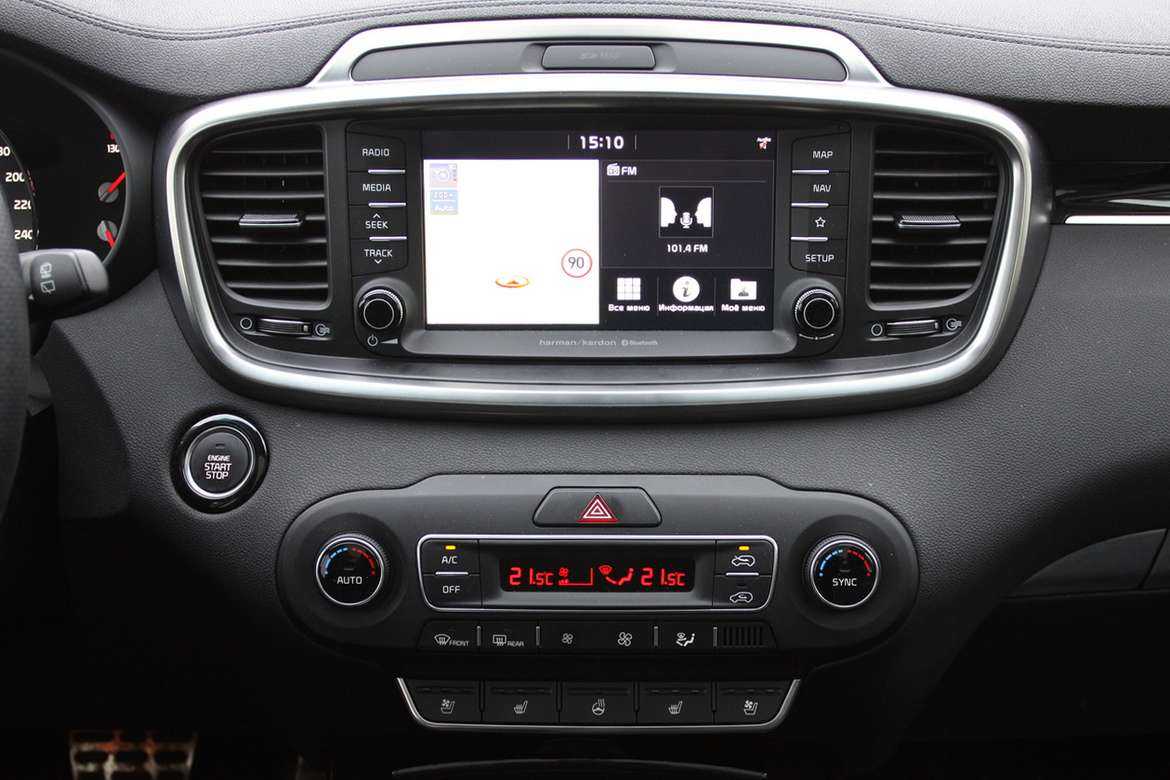 Начиная со средней комплектации Premium Соренто становится трехрядным. Взрослым пассажирам на галерке ожидаемо тесно.Обилие кнопок поначалу сбивает с толку, но привыкнуть к ним — вопрос времени.В максимальной комплектации Premium+ вместо традиционного селектора автомата вот такая шайба и электронный ручник. В других версиях стояночный тормоз с механическим приводом.Панорамный верх появляется в комплектации Premium