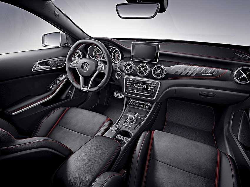 Для топ-версии GLA45 AMG дополнительно предлагают полный электропакет с памятью, спортивную трансмиссию AMG SpeedShift, систему адаптивного управления головным светом фар, спортивные сиденья с электроприводом, эксклюзивная AMG-отделка салона особой анилиновой кожей и панелями из карбонового волокна и 19-дюймовые легкосплавные колесные диски вкупе с низкопрофильными спортивными шинами.