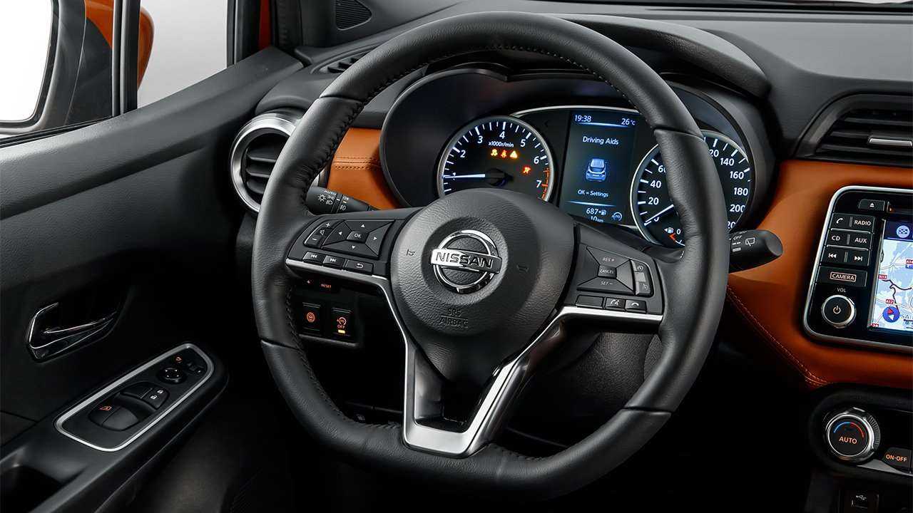 При внешней оценке салона автомобиля, в глаза бросается современный мультимедийный руль, с обрезанной нижней частью обода. Приборная панель, у Nissan Micra генерации 5, выполнена в классическом стиле, имеет два колодца тахометра и спидометра, между которыми расположен экран бортового компьютера. Воздуховоды отопителя приобрели более современный и стильный вид, теперь боковые имеют алюминиевую окантовку и круглую форму, а выходящие на центральную панель сделаны в виде узких прямоугольников