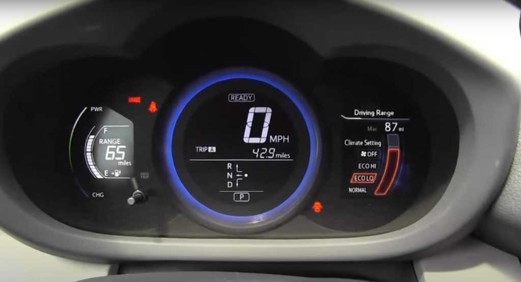 Панель приборов представлена единым цветным дисплеем. Диагональ составляет 3,5 дюйма. Условно разделена на 3 блока: спидометр, состояние батареи с тахометром и информация о состоянии систем автомобиля.