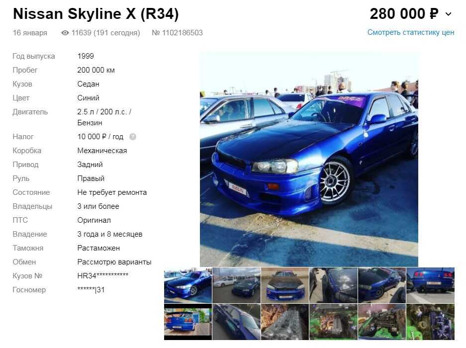 Самая высокая цена на Nissan Skyline R34 на “барахолках” – 3 200 000 рублей (это дороже любого нового автомобиля марки Nissan из доступных в России). Здесь уже тот самый 2,6 на 280 “лошадок” (RB26DETT). механическая коробка передач Getrag, однако привод указан задний, что говорит о том, что либо это не чистокровный GT-R, а некая переделка, или же с годами у него отпал полный привод.