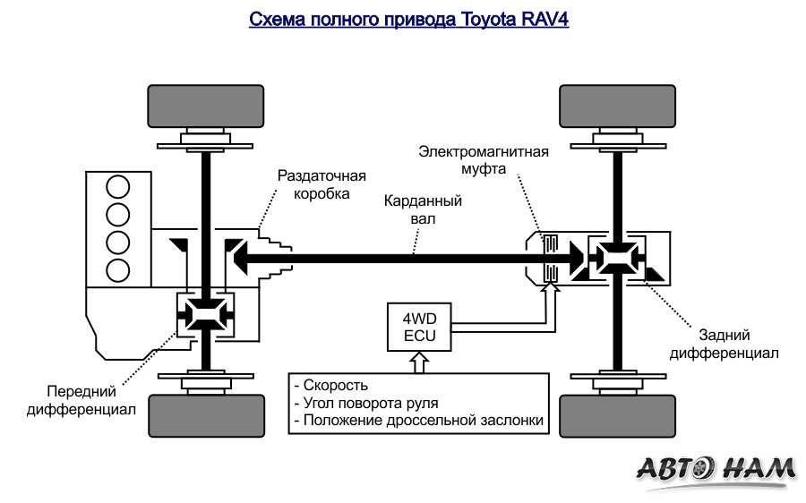 За распределение усилий между колесами кроссовера Тойота РАВ 4 отвечает система Dynamic Torque Control 4WD (DTC), которая является более продвинутой версией системы Active Torque Control (ATC). Схема полного привода предусматривает отсутствие межосевого дифференциала, а функция подключения задней оси возложена на электромагнитную муфту, расположенную перед редуктором заднего моста. По умолчанию крутящий момент распределяется между осями в соотношении 100:0, т.е. тяга полностью отправляется на передние колеса. При возникновении пробуксовки или недостаточной поворачиваемости на виражах пропорция изменяется вплоть до 50:50.
