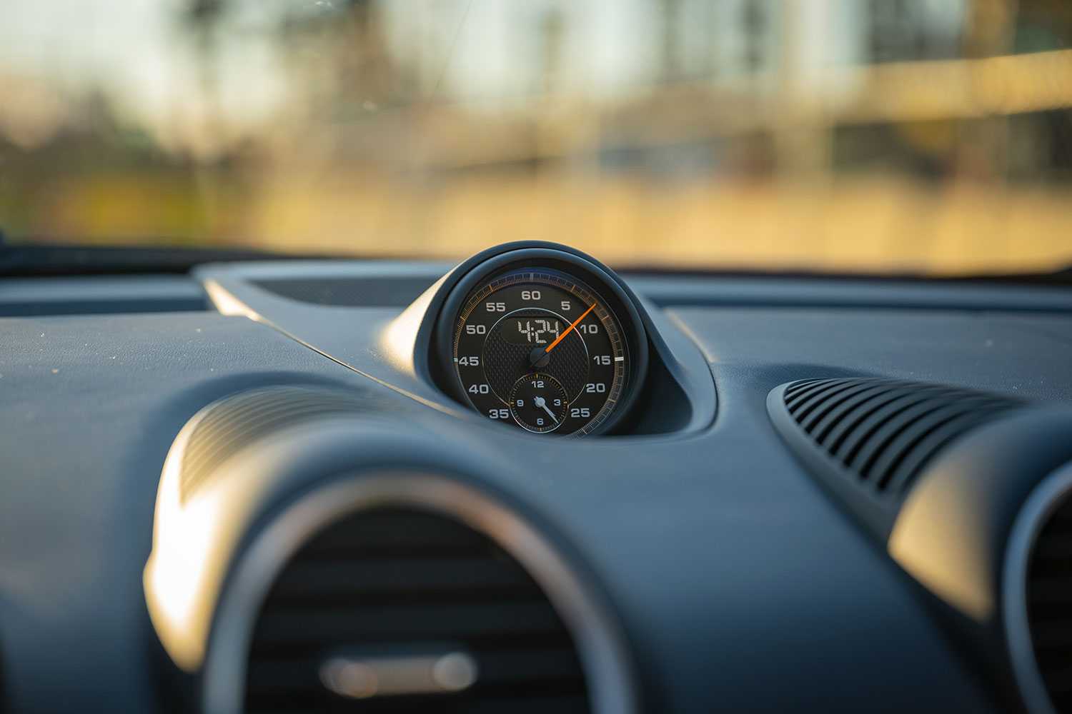 Porsche does an excellent job of carrying their DNA through each generation of car. As a result, sitting in this 718 is a lot like sitting inside a 911 from 30 years ago. Everything is where you expect it to be. The chronograph-like dials are beautiful, precise and easy to read. A digital screen embedded in the right circle tells you ancillary information, but the tach is front and center. This GT4 was also equipped with the Chrono package, adding a little stop watch atop the dash