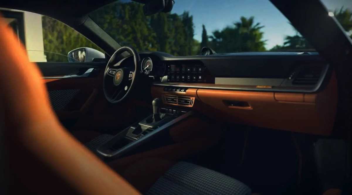 Compared to its predecessor, the 992 is 45 mm (1.8 in) wider and now uses aluminium body panels. The 992 also has a new rear bumper with larger exhaust tips than its predecessor. The front of the car is designed to mimic the appearance of an early 911 in a modern fashion. 992 models have electrical pop-out door handles, a retractable rear spoiler (for specific models only) and LED headlights. All models also feature a full-length rear light bar. The interior also has received significant changes including a straighter dashboard which harks back to the shape of the dash board used on the classic 911. The instrument cluster consists of two 7-inch digital displays and an analogue tachometer. Also a reference to the classic 911 models.