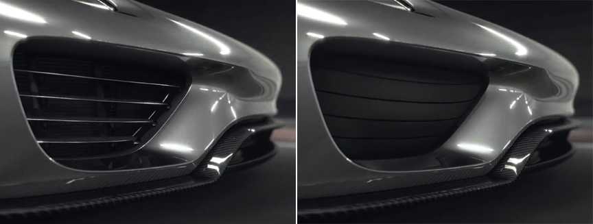 Active aerodynamics: the ribs are closed when the cooling is not needed in order to reduce aerodynamic drag. Porsche