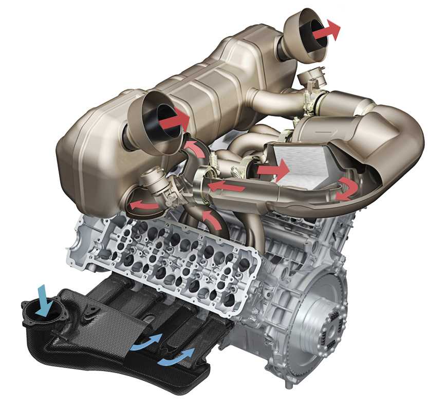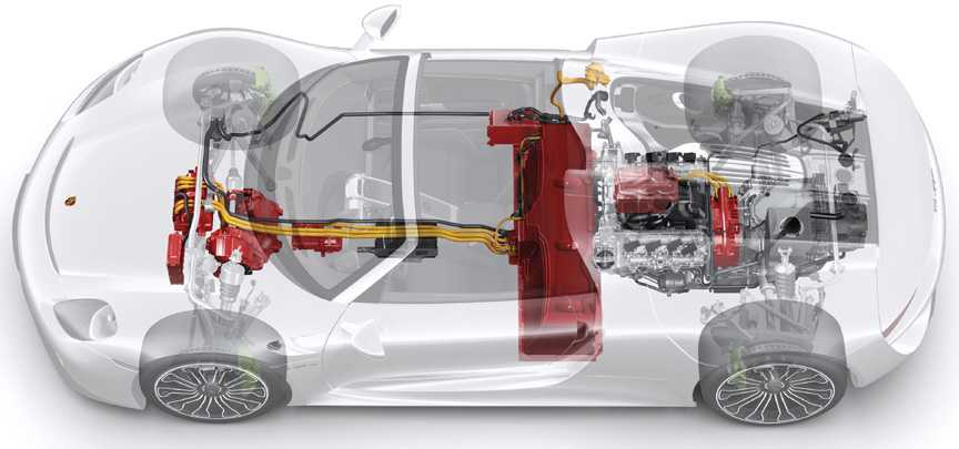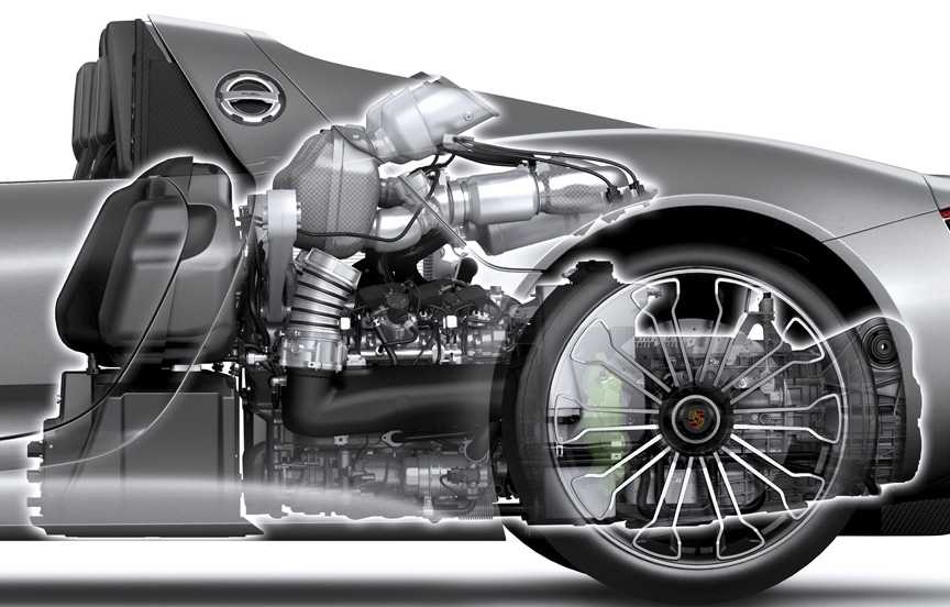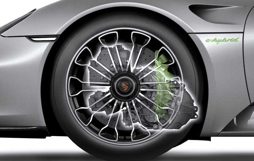 The engine weighs 135 kg according to Porsche and delivers 608 horsepower (453 kW) at 8,500 rpm and 528 N·m (389 lbf·ft) of maximum torque. This is supplemented by two electric motors delivering an additional 279 hp (208 kW). One 154 hp (115 kW) electric motor drives the rear wheels in parallel with the engine and also serves as the main generator. This motor and engine deliver power to the rear axle via a 7-speed gearbox coupled to Porsche’s own PDK double-clutch system. The front 125 hp (93 kW) electric motor directly drives the front axle; an electric clutch decouples the motor when not in use. The total system delivers 887 hp (661 kW) and 1,280 N·m (940 lbf·ft) of torque. By October 2012, the engineering design was not finalized, but Porsche provided performance figures of: