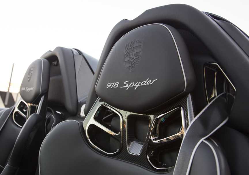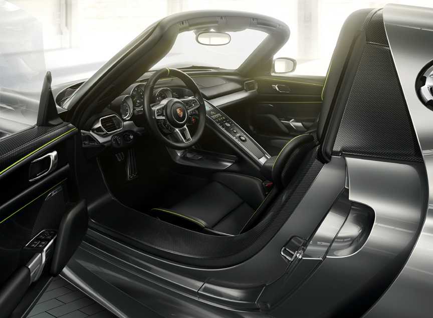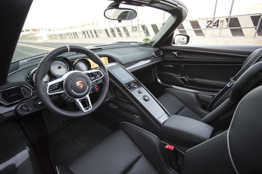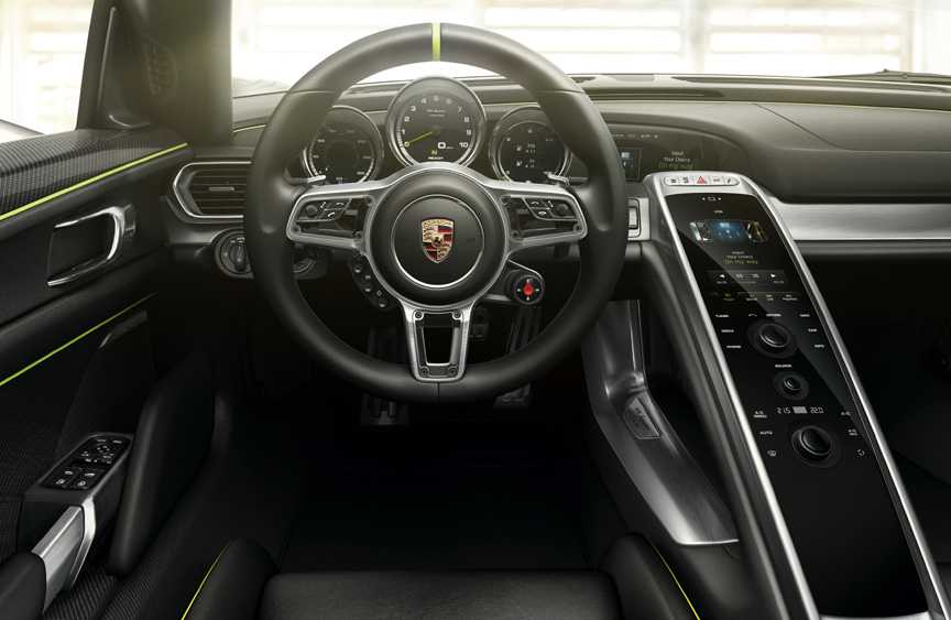 Интерьер отличается тем, что он гораздо более урезан и ориентирован на конкуренцию. Вместо пассажирского сиденья — маховик-аккумулятор, а на центральной консоли — кулисные переключатели вместо эргономичной консоли с сенсорным экраном для 918 Spyder. Текущая передача отображается на рулевом колесе, а функция рекуперации энергии отображается на рулевой колонке перед экраном дисплея.