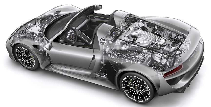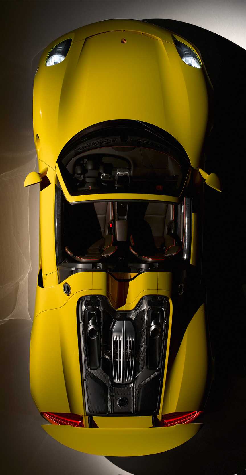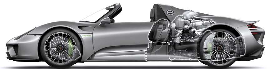 The 918 Spyder is a mid-engined two-seater sports car designed by Michael Mauer. It is powered by a 4.6 litre V8 engine. The engine is built on the same architecture as the one used in the RS Spyder Le Mans Prototype racing car without any engine belts.