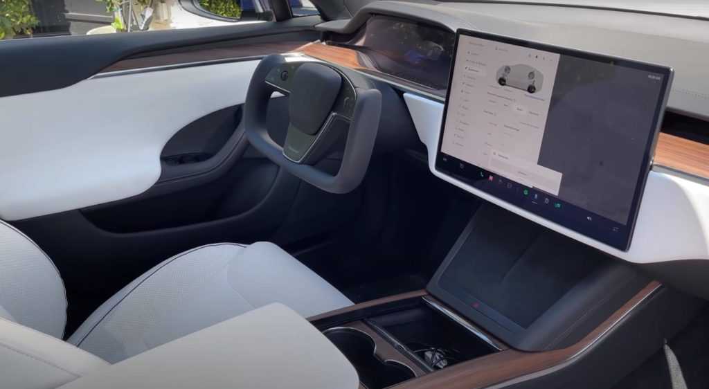 Салон сохраняет фирменный минимализм. Во всех деталях он представлен на фото Тесла Модель S Plaid.