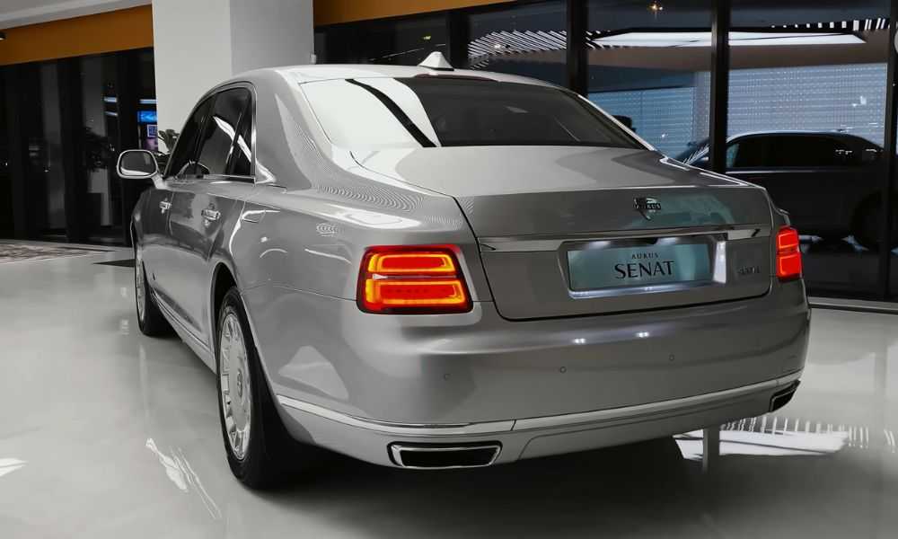 На корме Aurus Senat нет много декоративных деталей, разве что, небольшая хромированная вставка на крышке и «шильдик» компании. Бампер получился сдержанным и не имеет лишних элементов. Можно заметить лишь хромированную окантовку и два наконечника выпускной системы. Тут очень узнается стиль Bentley. Снаряженная масса Аурус Сенат – 2 740 кг, что довольно много. А вот бронированный лимузин целых 6 500 кг.