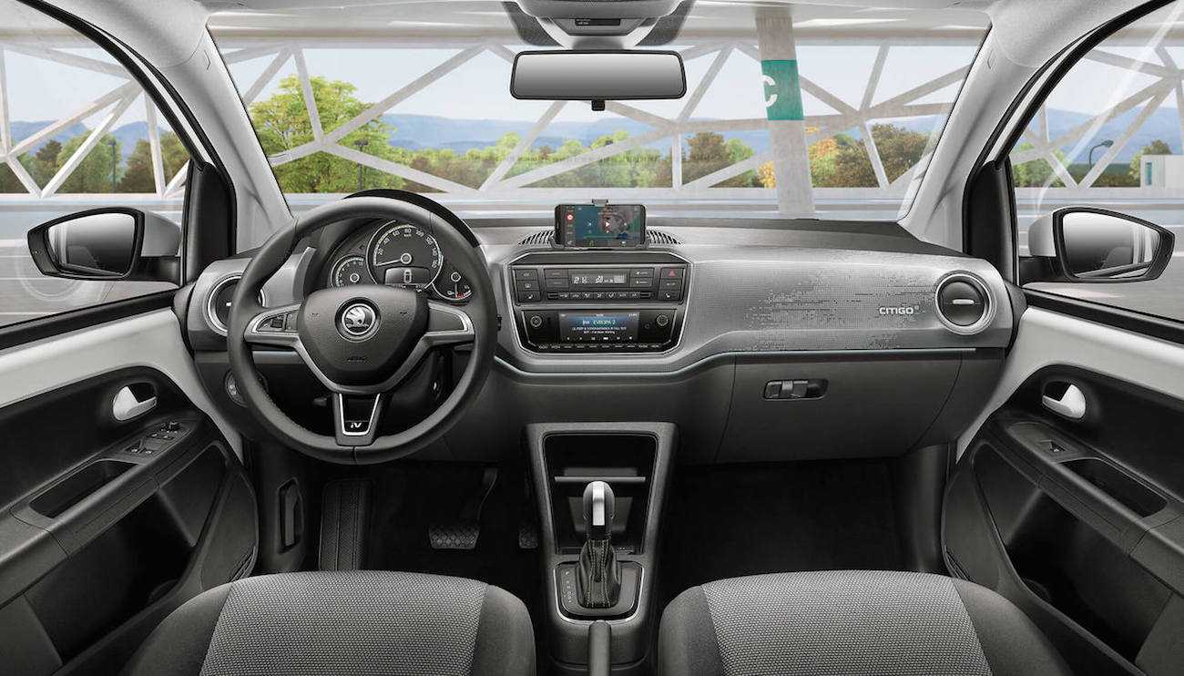 Интерьер также стал более современным и обзавелся новыми деталями и оборудованием. В салоне присутствует новое рулевое колесо, модернизированная панель приборов, климат-контроль со стильным и удобным блоком управления пришел на смену кондиционеру, модернизированная развлекательная система Blues and Swing с цветным 5-дюймовым сенсорным экраном (aux-in, SD card, USB, Bluetooth, возможность подключения смартфонов через операционные системы iOS и Android), акустическая система с 6 динамиками, зонтик под передним пассажирским креслом, а также множество мест для хранения мелких вещей. Чешский сити-кар оснащается продвинутой электронной системой безопаснсоти City Safe Drive с функцией автоматического торможения (работает на городских скоростях движения от 5 до 30 кмч). Возможно, благодаря увеличившейся габаритной длине кузова пассажирам на задних сиденьях будет более комфортно. Полезный объем багажника однако не изменился и варьируется от 251 литра за спинками второго ряда до 951 литра при условии сложения задних сидений.