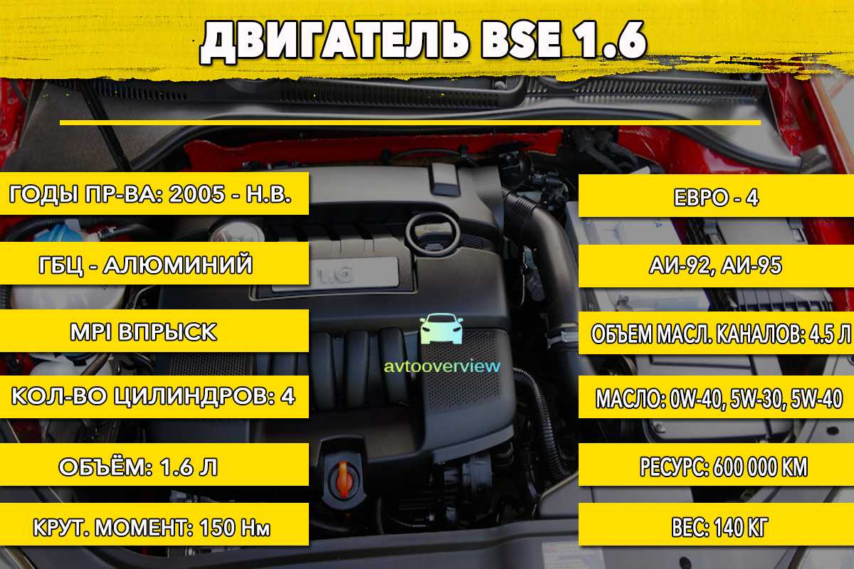 Двигатель Volkswagen, Skoda BSE представляет собой рядный бензиновый четырехцилиндровый атмосферник объемом 1,6 литра, мощностью 102 л. с и крутящим моментом 148 Нм.