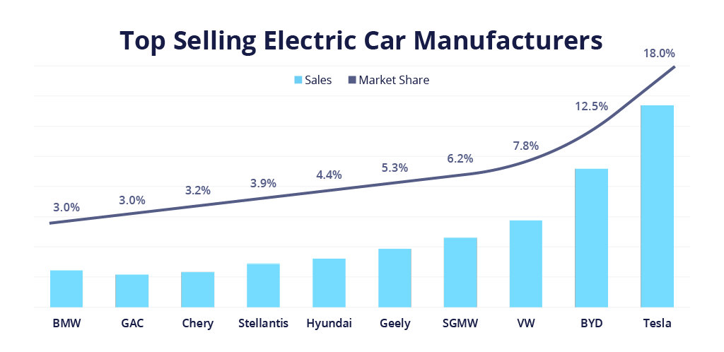Но на рынке электромобилей идет серьезная борьба между Tesla и BYD. Мы покажем 10 самых продаваемых производителей BEV в 2022 году: