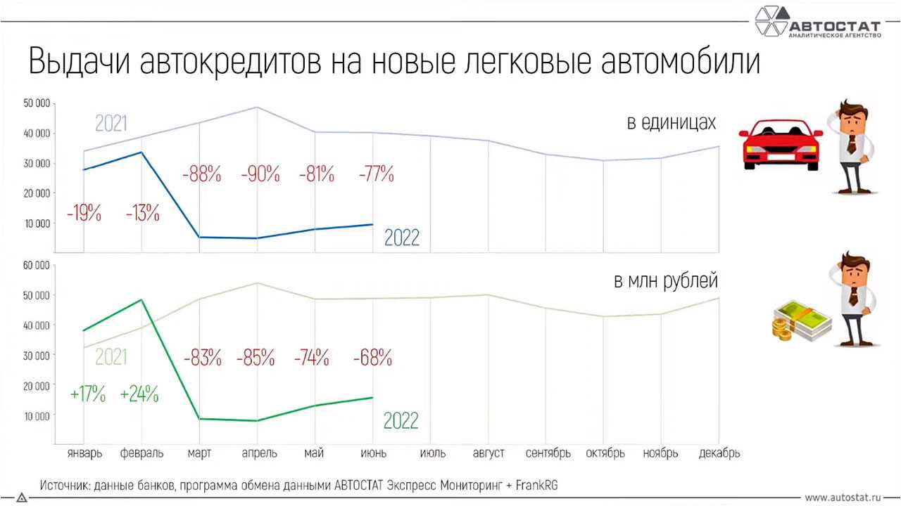 Эксперты связывают падение объемов автокредитования с повышением ЦБ РФ ключевой ставки до 20%. По мере снижения ключевой ставки автокредитование начало восстанавливаться.
