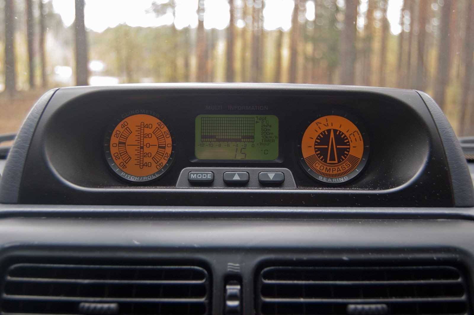 Скажу по секрету: у меня когда-то давно была Тойота, и я её любил. Поэтому и за руль Прадо я садился с удовольствием. Есть тут свои фишки. Например, вот этот бортовой компьютер с навигационным комплексом (кренометр, альтиметр, компас). Классная ведь штучка, не так ли? На рестайлинговых 90-х он был цветным, но у нас хотя бы тут почти «по стоку» – монохромный. Почти – потому что подсветку опять-таки пришлось заменить.