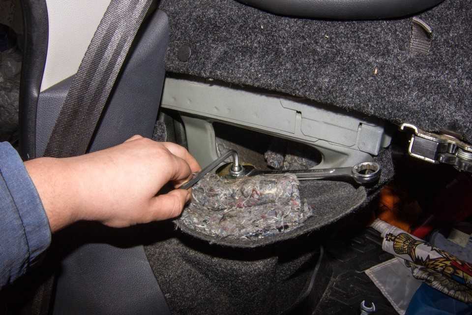 1. Чтобы подобраться к задним амортизаторам необходимо откинуть спинки сидений и снять обшивку. Это прекрасно видно на фотографии. Тут понадобился шестигранник на “6”, ключи на 17 и 19. Поднимаем машину на домкрате, откручиваем колесо.