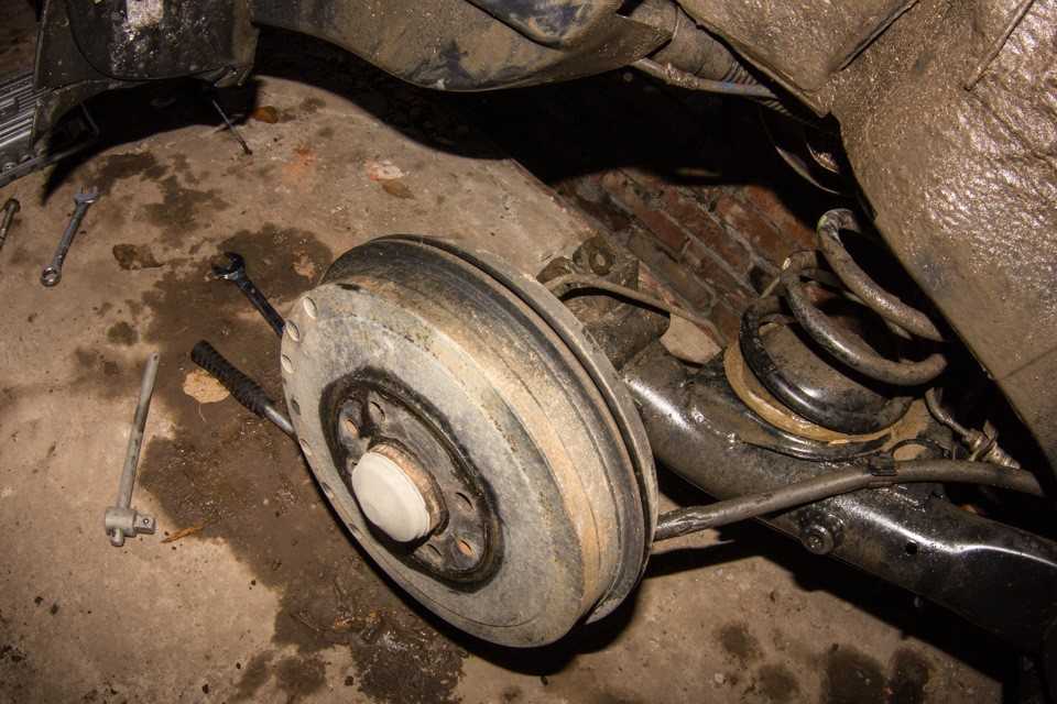- поддомкрачиваем заднюю часть кузова, снимаем задние колеса, устанавливаем автомобиль на подпорки;