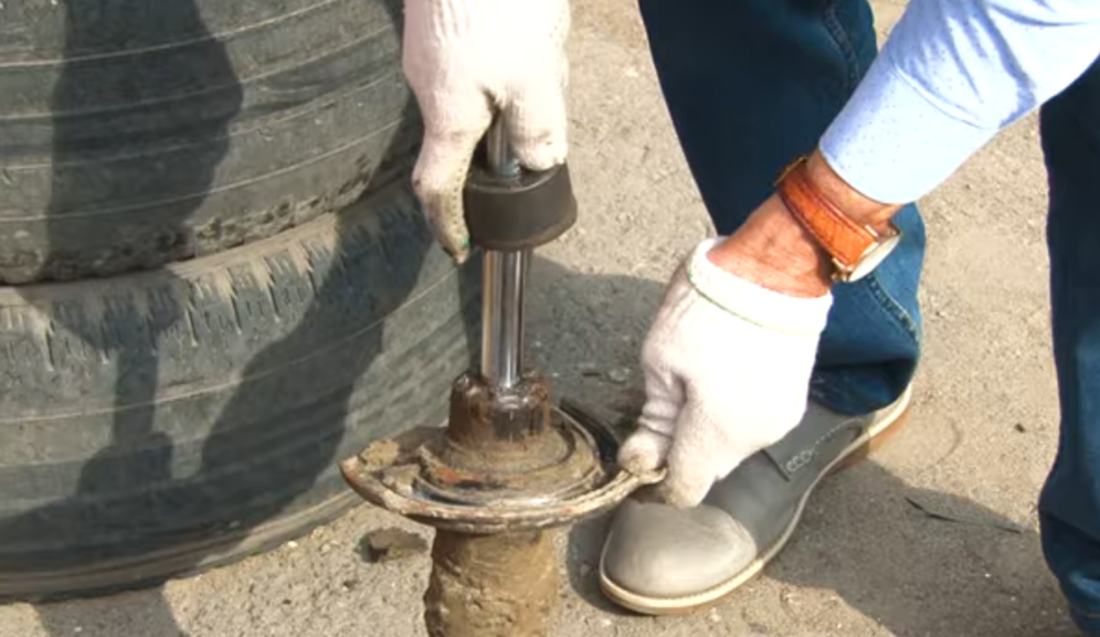 Если при монтаже амортизатора шток недостаточно выступает из кузова, наденьте на него шайбу подушки, навинтите гайку и любым ключом (как рычагом) вытяните шток, опираясь на брызговик.