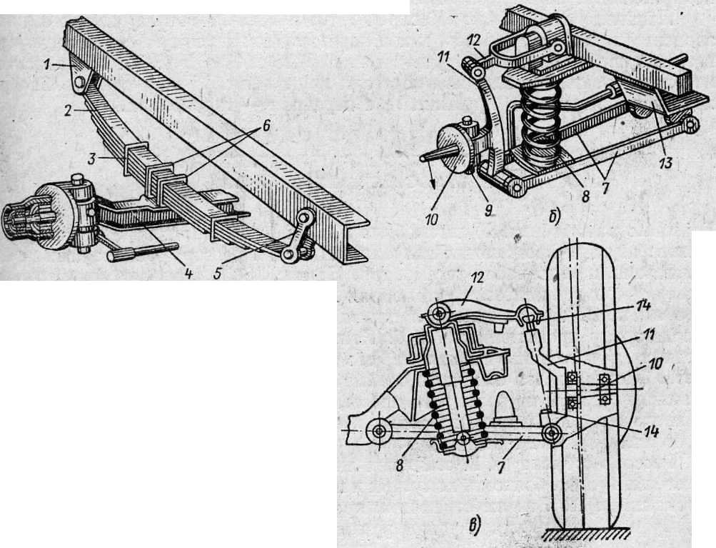 а — зависимая; б — независимая шкворневая; в — независимая бесшкворневая; 1 — кронштейн; 2 — рессора; 3 — хомут; 4 — балка переднего моста; 5 — серьга; 6 — стремянка; 7 и 12 — рычаги; 8 — пружина; 9 — шкворень; 10 — поворотный кулак; 11 — поворотная стойка; 13 — поперечина подрамника; 14 — палец