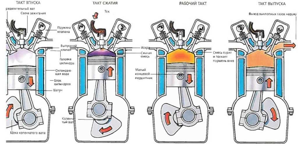 Но это только принцип работы с пояснением на простых составляющих. На деле же процесс выглядит несколько сложнее, ведь надо же вначале обеспечить поступление смеси в цилиндр, сжать ее для лучшего воспламенения, а также вывести продукты горения. Эти действия получили название тактов.