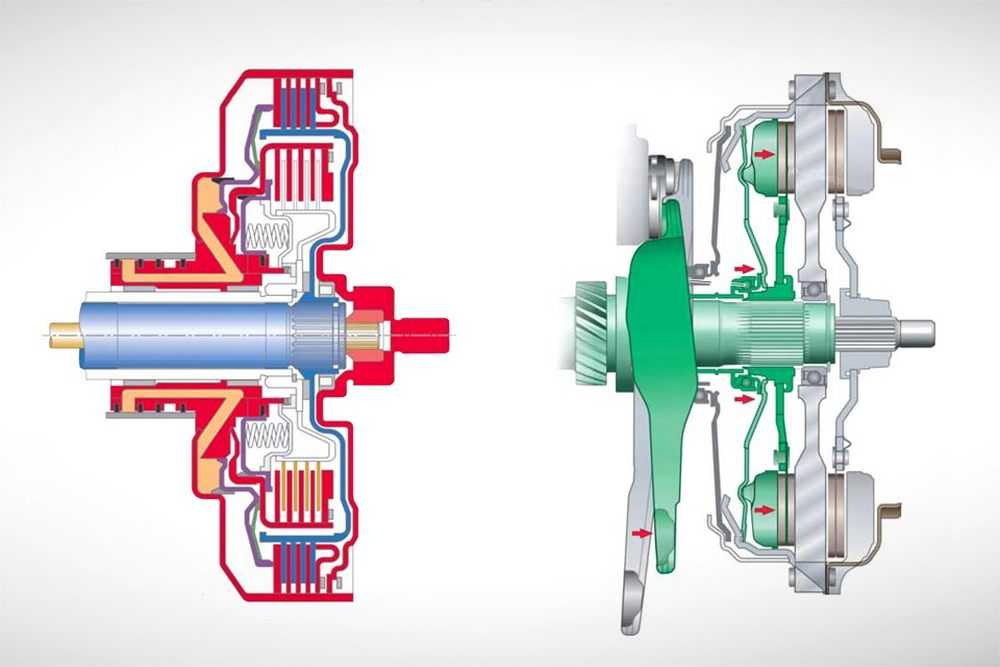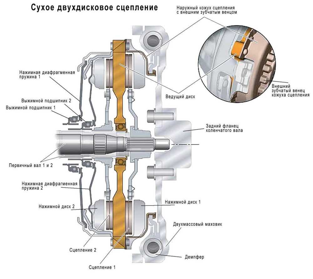 Система подобного сцепления отличается от традиционного. Деталь состоит из 2 элементов, которые связаны системой пружин. Именно они поглощают рывки, вибрацию и другие нарушения вращения. В подобных конструкциях роль сцепления выполняет внутренний вал. Нажимной вал присоединяют к коленвалу, а ведомый – к механической КПП.