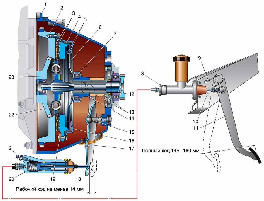 устанавливается зазор 0,1–0,5 мм между толкателем и поршнем главного цилиндра (см. рис. Педаль и главный цилиндр привода сцепления ). Этот зазор, необходимый для полного выключения сцепления, регулируется ограничителем 14 педали сцепления. Зазор определяется свободным ходом педали, равным 0,4–2 мм;