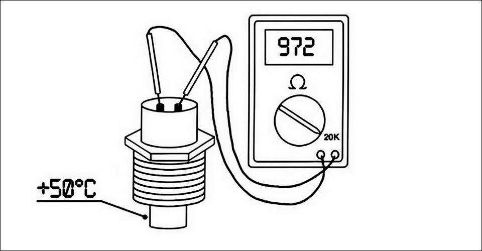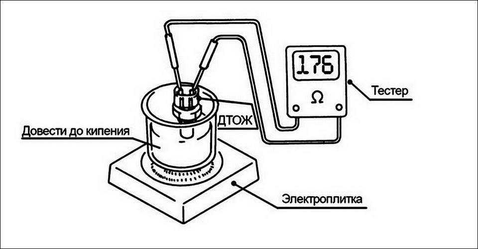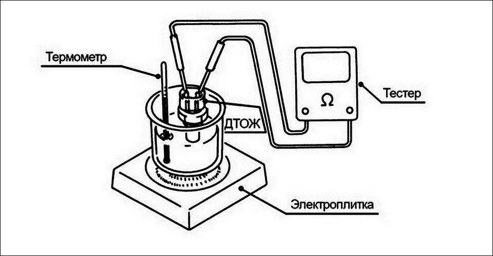 Прибор необходимо демонтировать, подключить его к измерителю в режиме омметра, погрузить в ОЖ и начать ее нагревать. В ту же субстанцию опускается термометр и путем сравнения со специальной таблицей (соотношение градусов Цельсия и Ом) делаем выводы о работоспособности прибора.