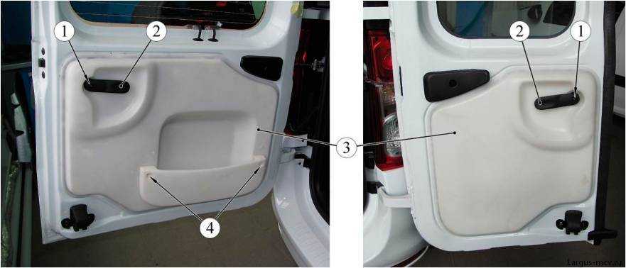 1 – винт крепления внутренней ручки открывания двери; 2 – внутренняя ручка открывания двери; 3 – обивка погрузочной двери; 4 – винт крепления обивки