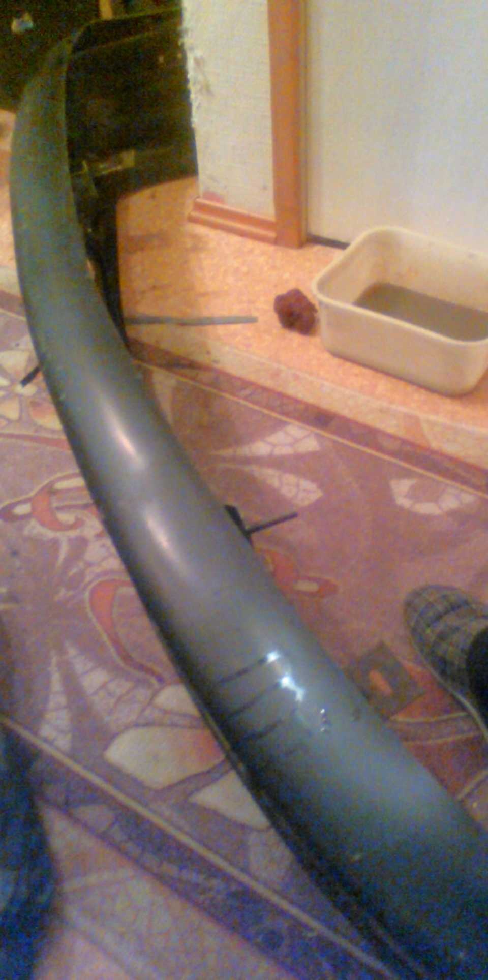 Теперь нужно избавиться от вмятины. Берем фен (в моем случае 1600W), греем вмятину, встаем ногой на вмятину изнутри, как гласит инструкция в интернете, поскальзываемся и получаем бампером по загривку. Больше не читаем инструкций в интернете и включаем смекалку. Опускаем бампер в ванну и включаем воду, постепенно повышая температуру, чтоб от резкого перепада не лопнул пластик, давим на вмятину изнутри (достаточно небольшого усилия) и пузырь встает на место.Резиновую ленту садим на клей и крепим саморезами.Сборку и установку производим в обратном порядке.Собственно, вот: