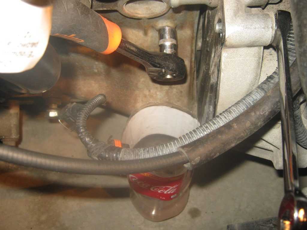 - Необходимо слить охлаждающую жидкость. Для этого следует ослабить хомуты на патрубках, ведущих к радиатору. Жидкость сливается в заранее подготовленную ёмкость.