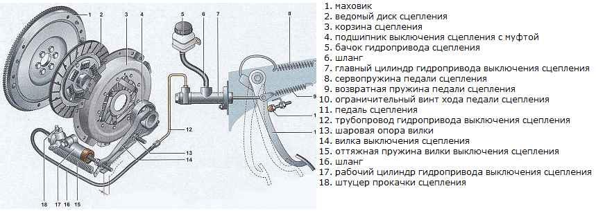 - Механический (тросиковый). Педаль сцепления связана тросом с вилкой выключения сцепления. Перемещение троса изменяет позицию вилки, которая передвигает выжимной подшипник в направлении нажимных демпферных пластин.