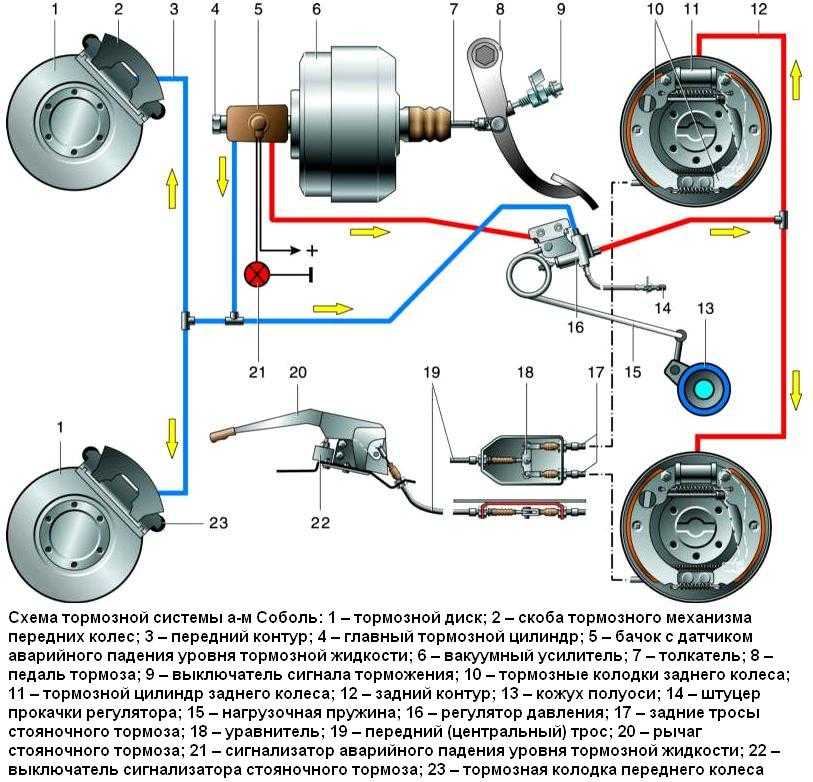 Автомобиль Соболь имеет рабочую и стояночную тормозные системы. Рабочая тормозная система гидравлическая, двухконтурная (разделена на передний и задний контуры), с вакуумным усилителем, регулятором давления в приводе задних тормозов и датчиком аварийного падения уровня тормозной жидкости в бачке.