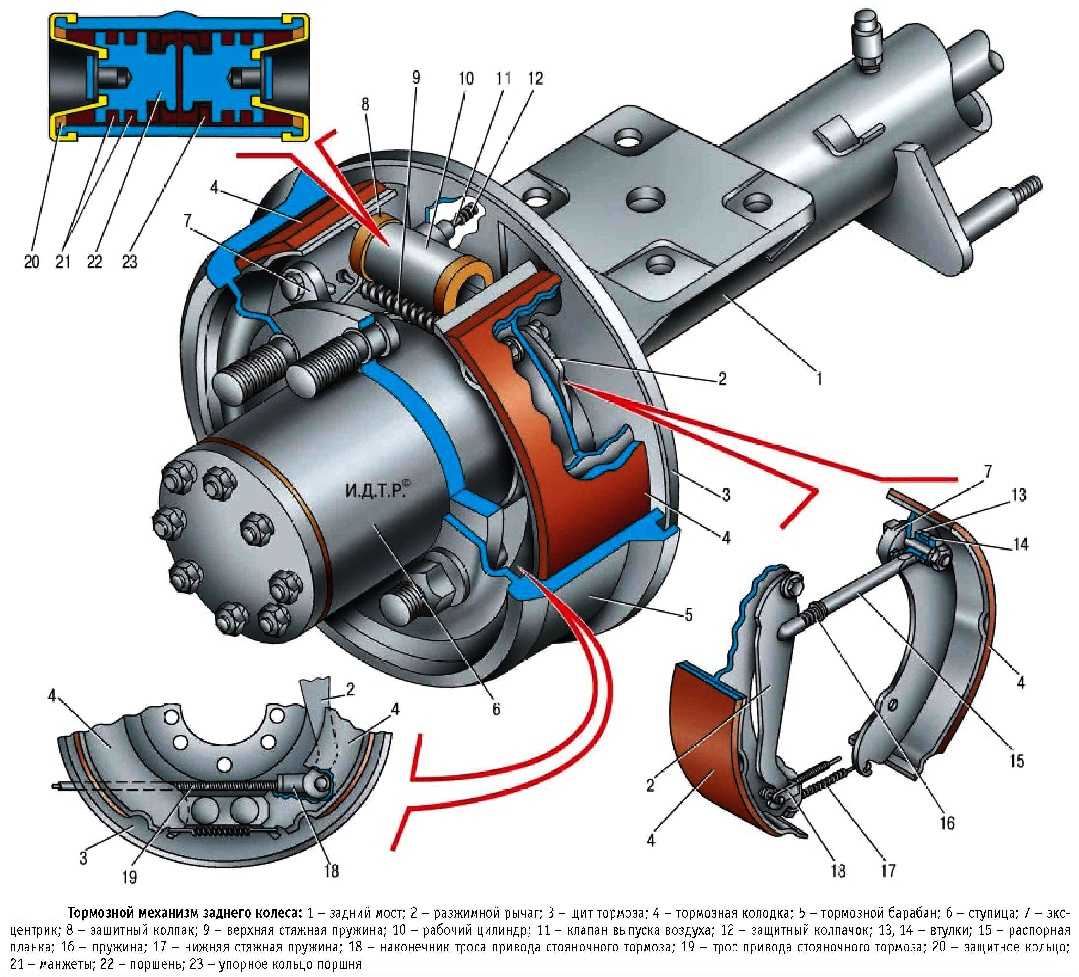 По мере износа колодок кольца сдвигаются на величину износа, за счет чего поддерживается постоянный зазор между колодками и барабаном. В верхней части тормозных колодок расположены эксцентрики для регулировки привода стояночного тормоза.