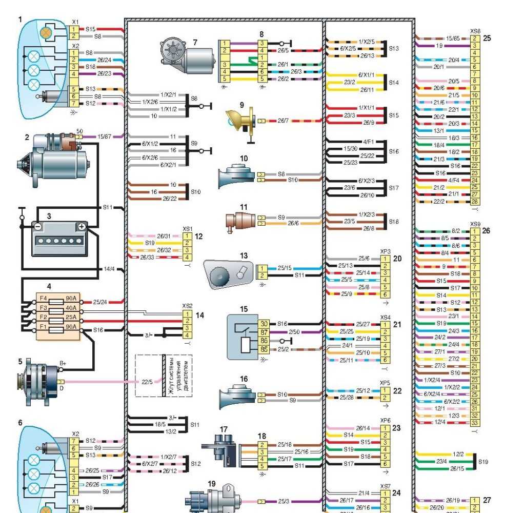 1 – блок-фара правая; 2 – стартер; 3 – аккумуляторная батарея; 4 – блок предохранителей в моторном отсеке; 5 – генератор; 6 – блок-фара левая; 7 – очиститель ветрового стекла; 8 – колодка соединения со жгутом проводов очистителя ветрового стекла; 9 – подкапотная лампа; 10, 16 – звуковой сигнал; 11 – омыватель ветрового стекла; 12, 14 – колодки соединения со жгутом проводов антиблокировочной системы тормозов; 13 – датчик уровня тормозной жидкости; 15 – реле стартера; 17 – кран отопителя; 18 – колодка соединения со жгутом проводов крана отопителя; 19 – насос дополнительного отопителя; 20, 21, 22 – колодки соединения со жгутом проводов системы управления двигателем; 23, 24 – колодки соединения с задним жгутом проводов; 25, 26 – колодки соединения со жгутом проводов панели приборов; 27 – колодка соединения (не используется)