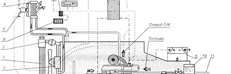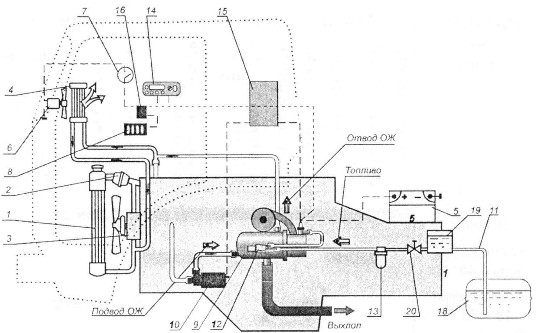 1 — радиатор системы охлаждения автомобиля; 2 — терморегулятор охлаждающей жидкости; 3 — водяной насос автомобиля; 4 — теплообменник системы отопления; 5 — АКБ; 6 — вентилятор системы отопления; 7 — выключатель вентилятора; 8 — блок предохранителей; 9 — подогреватель; 10 — электродвигатель с насосом; 11 -топливопровод; 12 — электромагнитный топливный насос; 13 — топливный фильтр; 14 — таймер — регулятор; 15 -блок управления работой подогревателя; 16 — реле управления работой вентилятора системы отопления; 18 — топливный бак автомобиля; 19 — бачок топливный; 20 — кран питания подогревателя топливом.