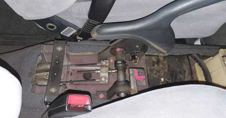 Основной узел для регулировки находится у основания рычага. В большинстве случаев придется снять обшивку и пластиковые вставки вокруг «ручника», чтобы добраться до нужного места. Если там стоит два тросика, то их объединяет металлическая пластина — уравнитель. Сначала советуем проверить натяжение вручную. Нажимаем на кнопку рычага и считаем щелчки. Если их более 6–7, дело плохо. Надо брать в руки ключ. Примерный вид регулировочного узла: