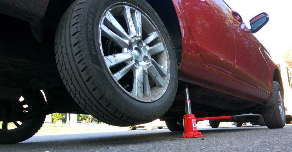 В большинстве машин «ручник» блокирует задние колеса. Надо вывесить одно из них. Первым делом стоит подложить под передние колеса противооткатные упоры. Если на борту механическая коробка передач, лучше включить первую скорость. Селектор «автомата» выставляем на режим «паркинг», это буква P. Баллонным ключом страгиваем болты на одном колесе, поднимаем домкратом